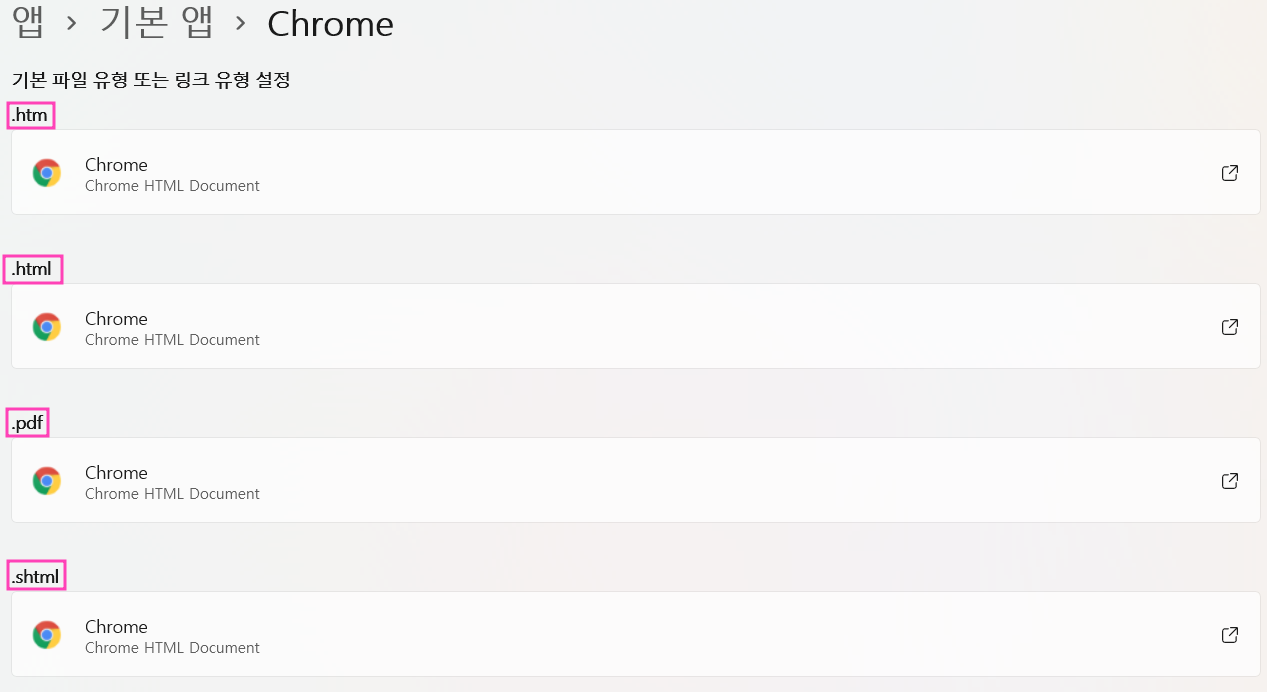 4. 기본 브라우저로 설정 원하는 앱을 선택 후 각각의 기본 파일 유형 또는 링크 유형을 설정 하시면 됩니다.