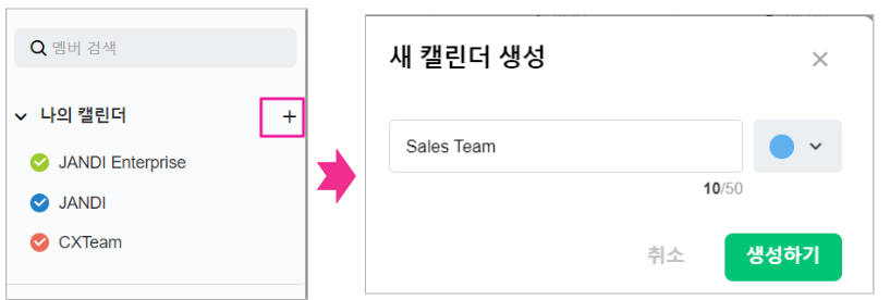 2. 나의 캘린더 + 클릭 후 캘린더 이름 및 일정에 표시될 색상을 선택해 주세요.