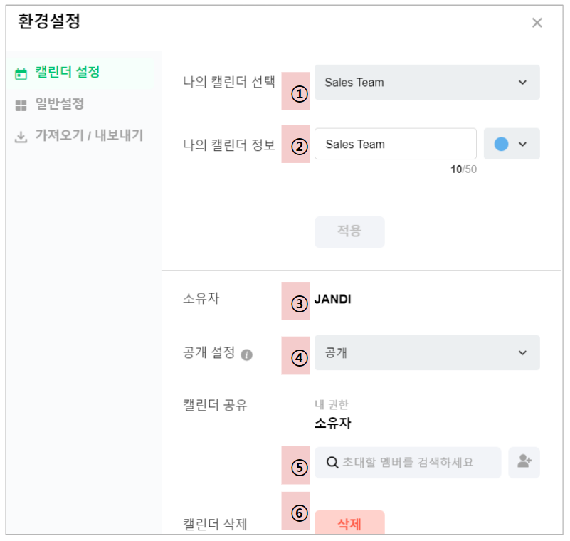 ② 캘린더 정보 : 캘린더 관리자 권한을 가진 멤버는 이름을 변경할 수 있고, 색상은 권한에 상관없이 변경 가능합니다.