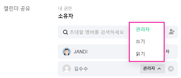 초대한 멤버를 선택 후 캘린더 권한(관리자, 쓰기, 읽기)을 부여할 수 있습니다.