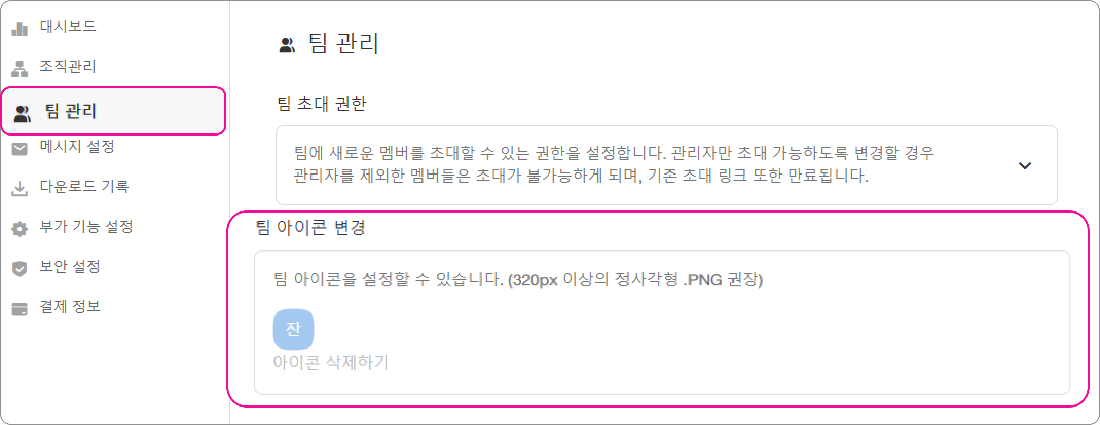 팀 아이콘은 회사 로고를 업로드하여 변경할 수 있습니다. 이를 통해 우리 회사만의 고유한 특징을 팀에 반영할 수 있습니다.