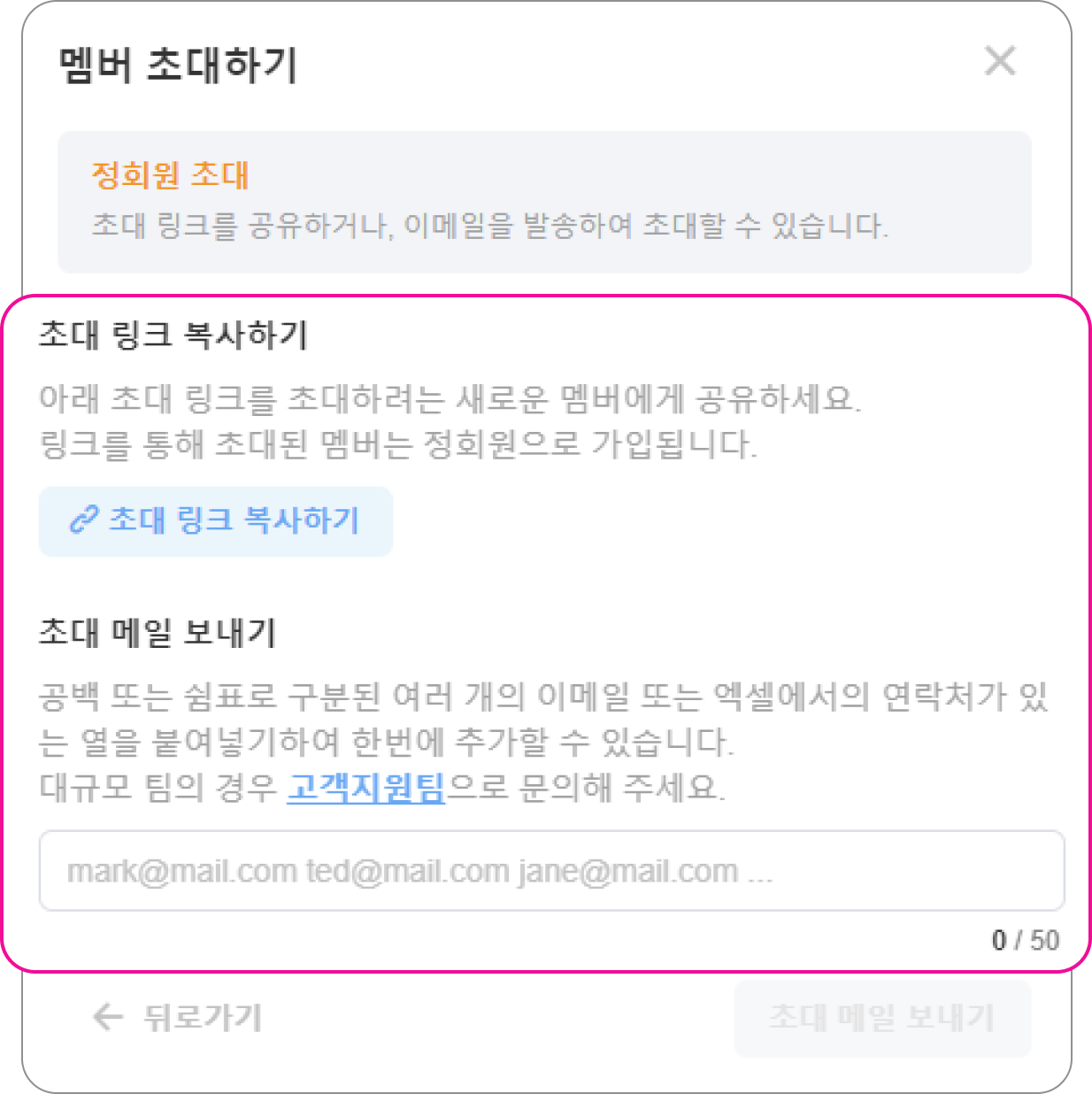 초대 링크를 복사하여 공유하거나, 초대 메일을 직접 발송하는 두 가지 방법이 있습니다.