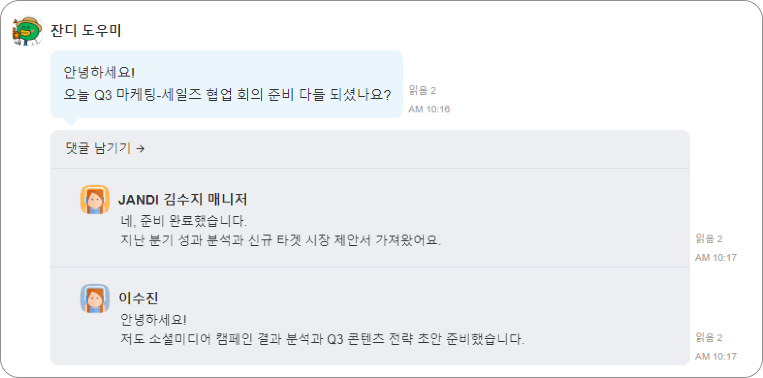 특정 메시지나 게시물 아래에서 관련 대화를 묶어, 본래 내용과 연결성을 유지하며 상세한 논의를 이어갈 수 있도록 돕는 기능입니다.