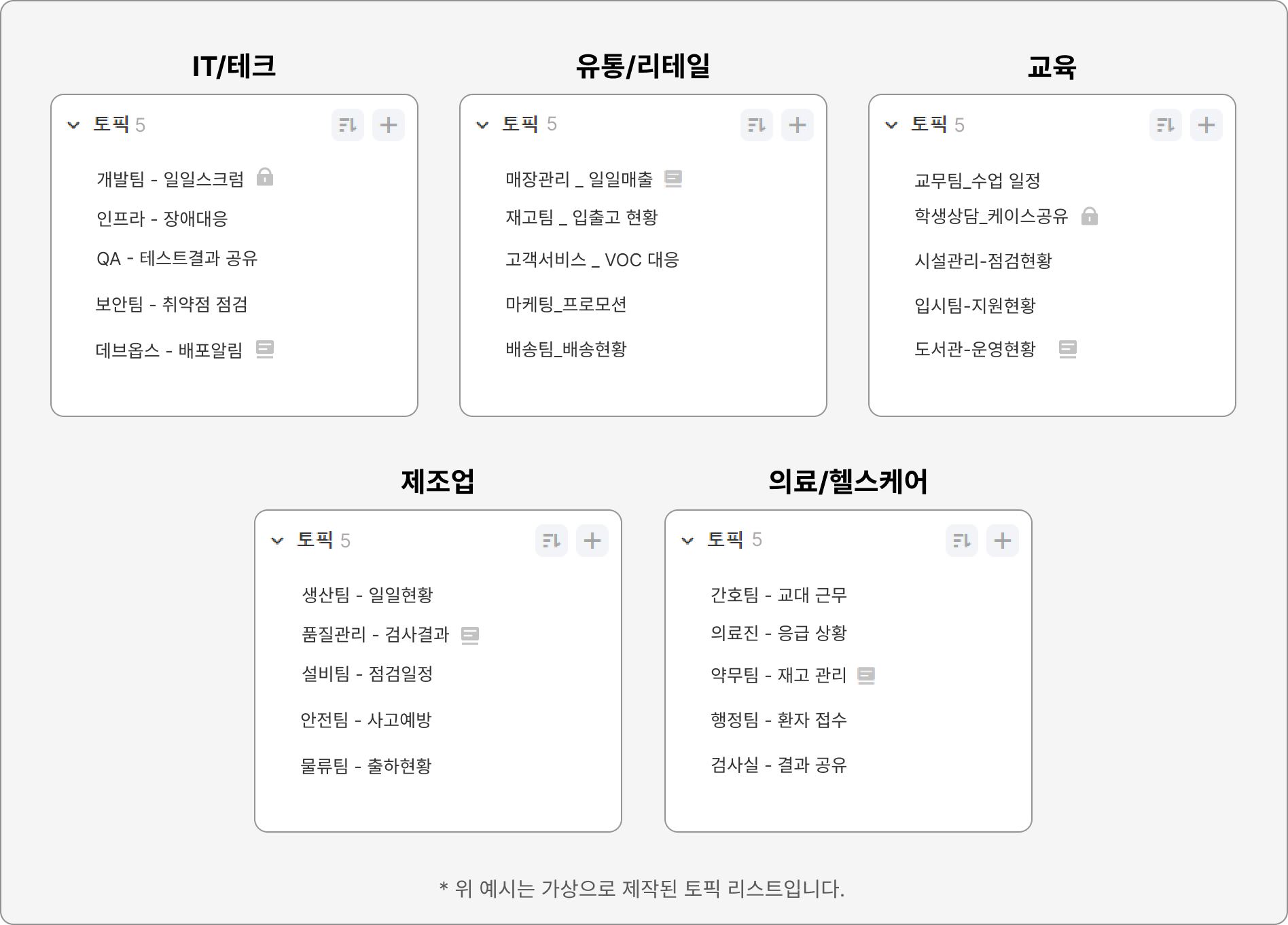 기본으로 세팅되어있는 토픽 외에도, 팀의 업무 특성과 필요에 맞춰 새로운 토픽을 생성하고 활용할 수 있습니다.