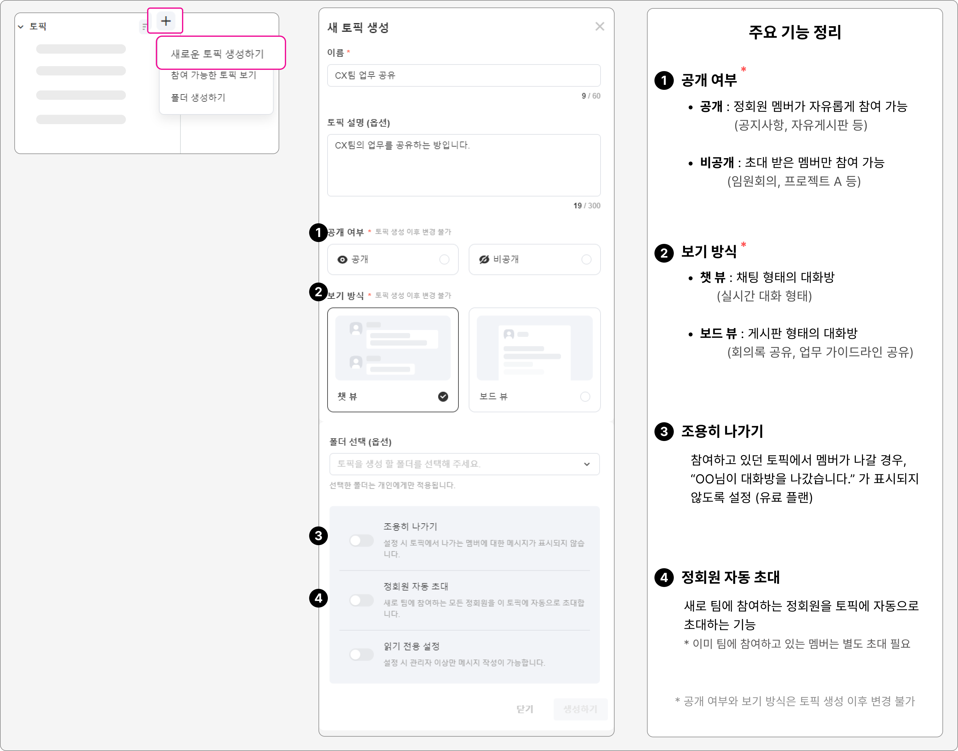 각 업무, 프로젝트 또는 활동에 맞추어 토픽을 생성하면, 관련 대화를 한 곳에 모아 관리하고 필요한 정보를 쉽게 찾을 수 있습니다.
