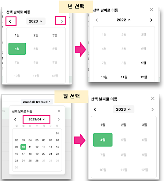 년 / 월 선택도 가능하고 만약 선택된 날짜에 대화가 없다면 해당 날짜와 가까운 날짜로 이동됩니다.