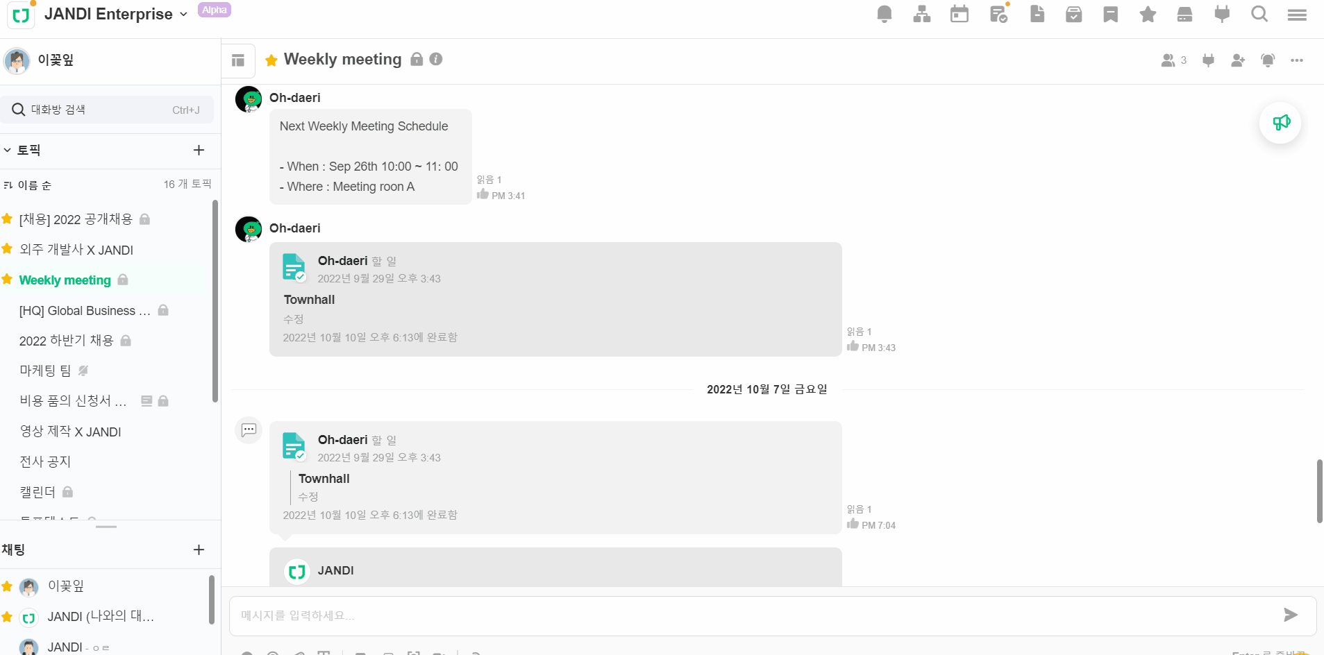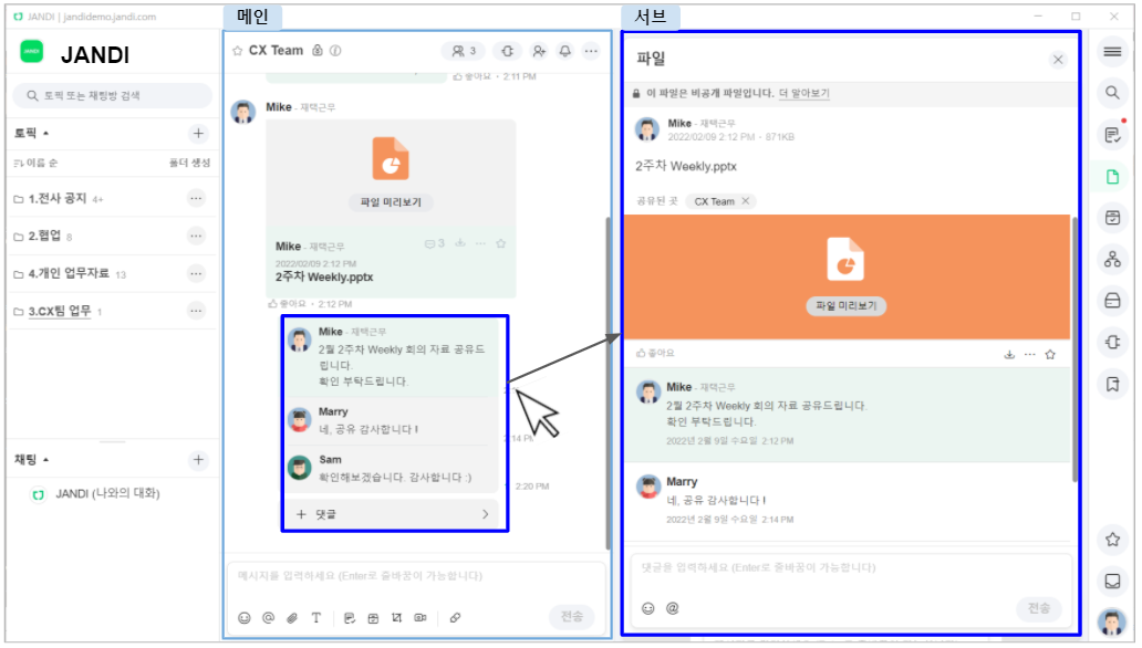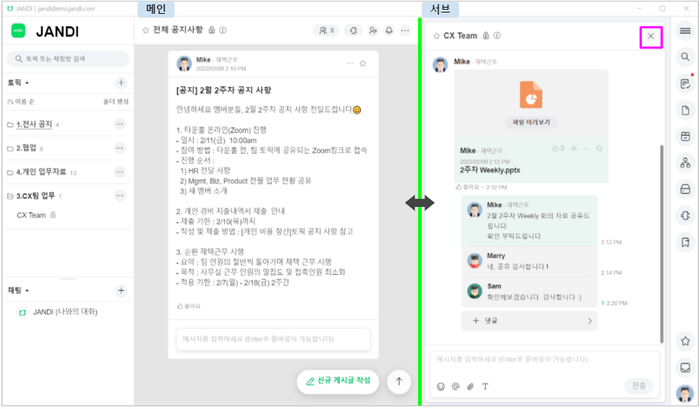 • 서브 화면의 대화방을 변경하려면, Ctrl (Mac: cmd) 누른 상태에서 다른 토픽/채팅방 명을 클릭해주세요.