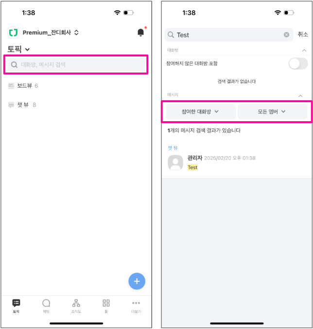 2. 작성한 대화방과 작성한 멤버로 필터링하여 검색할 수 있습니다.