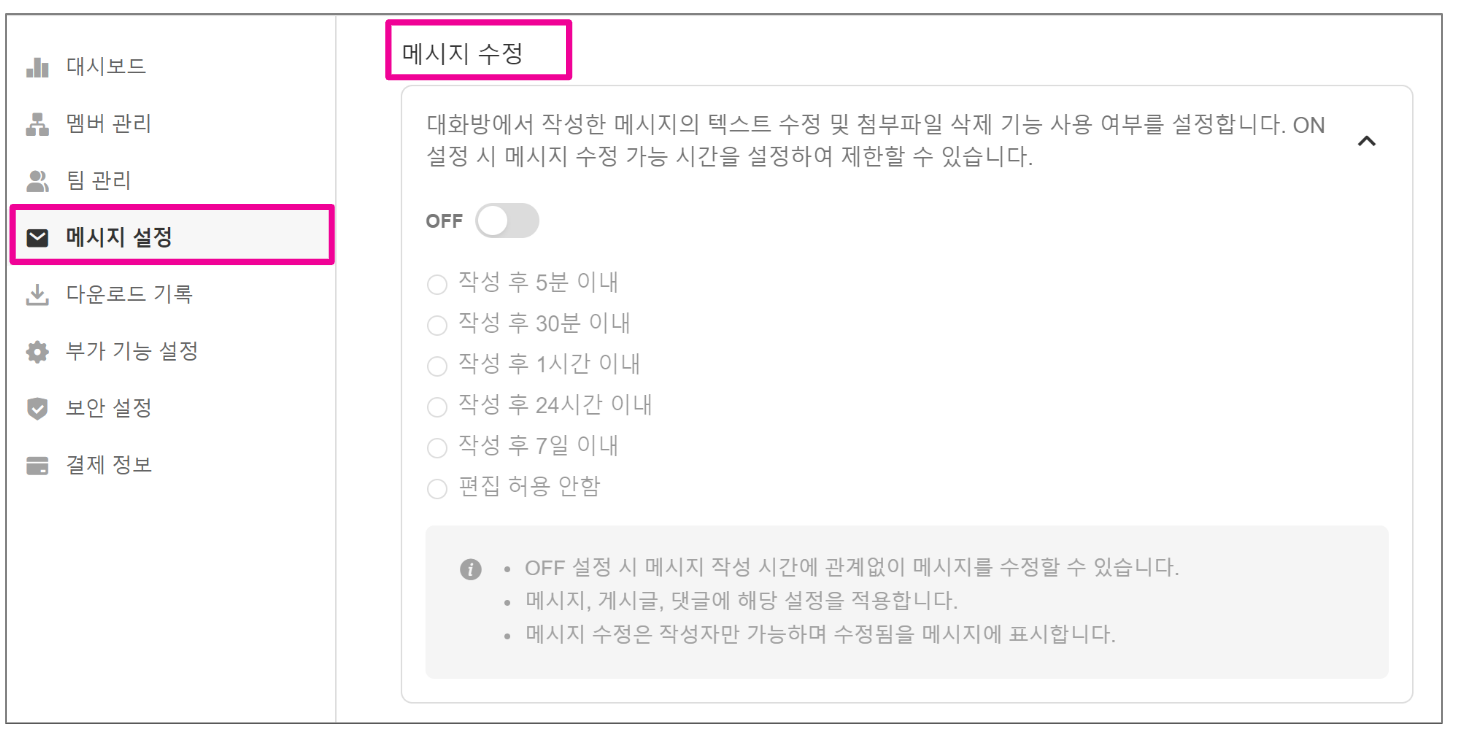 메시지 수정 기능 시간을 설정하여, 지정 기간 이후에는 메시지를 수정할 수 없도록 제한할 수 있습니다.