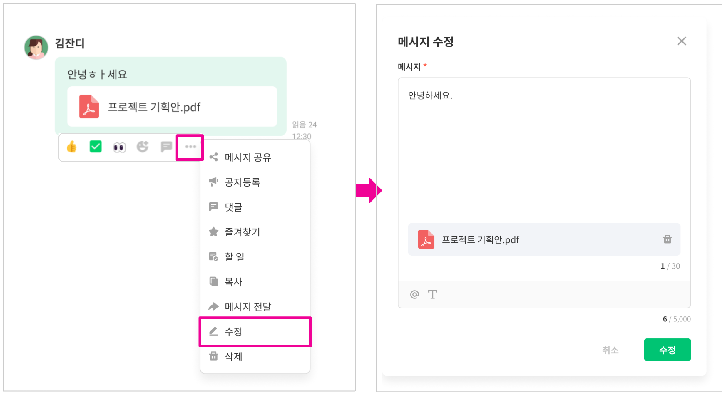 메시지 내의 오타 및 잘 못 첨부한 파일을 수정할 수 없어서 삭제 후 다시 메시지 작성했던 경험 있으신가요?