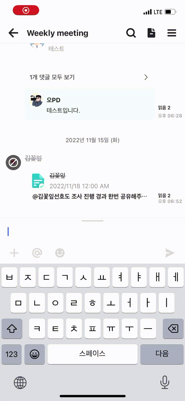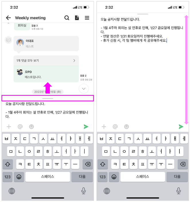 모바일의 작은 화면에서 메시지 입력창을 펼치면, 메시지 입력 공간을 넓게 사용하실 수 있습니다.대화방의 메시지 입력창 상단 부분을 ⬆️ 위 방향으로 밀어 올려주세요.우측 이미지와 같이, 메시지 입력창이 넓게 늘어납니다.