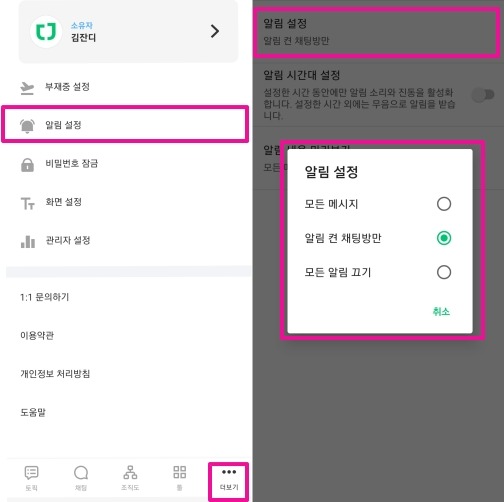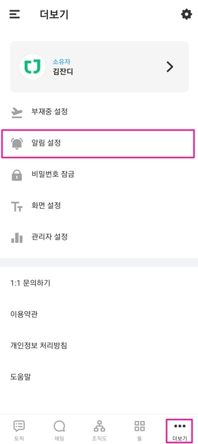 우측 하단 [...] 더 보기 - [알림 설정] 메뉴를 선택합니다.