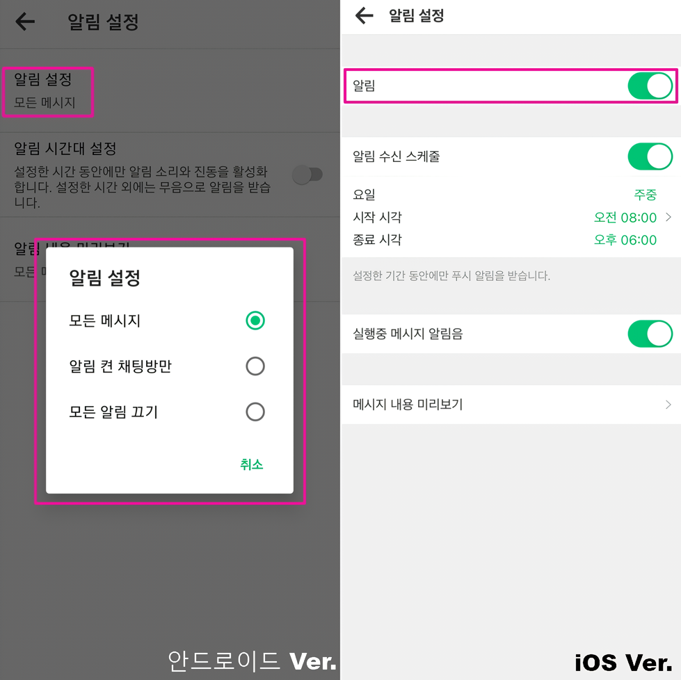 * iOS는 알림 수신 스케줄을 통해서 설정한 기간에만 푸시 알림을 받습니다.