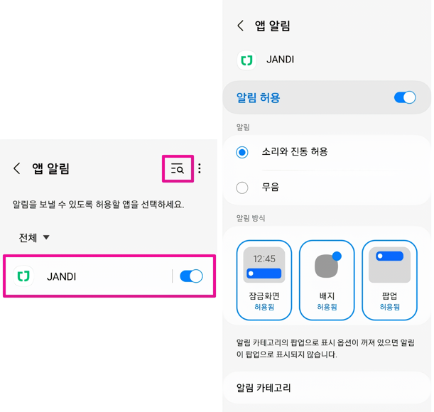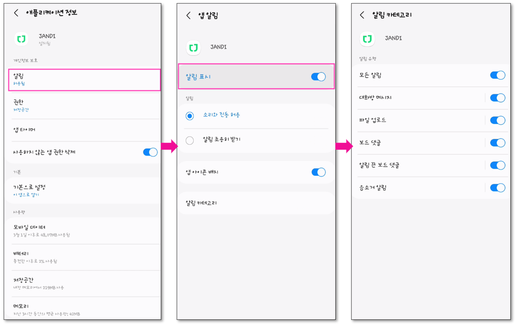 안드로이드 : 기기 설정 - 알림 - 앱 알림 - JANDI 검색 - 알림 허용 활성화