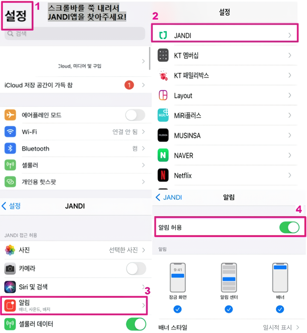 iOS : 기기 설정 > 스크롤바를 내려서 JANDI 찾기> 알림 > 알림 허용 활성화