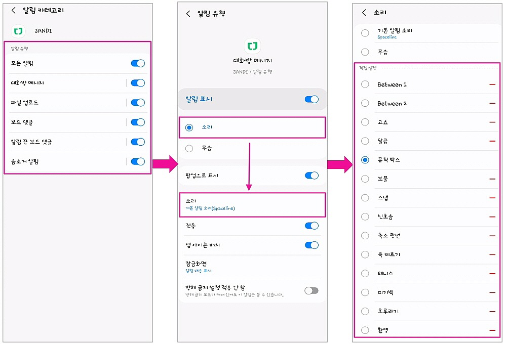 [알림] - [알림 카테고리] - [알림 유형] -[소리] - 설정 원하는 벨 소리 선택