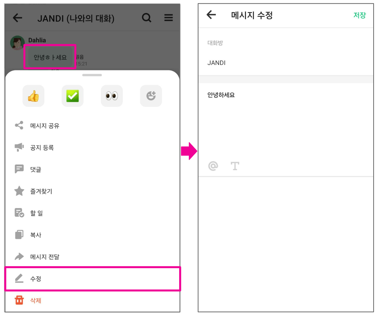 메시지에 마우스를 올렸을 때 나타나는 [...] 더보기 버튼을 클릭해 [수정] 메뉴를 선택하여 수정합니다.