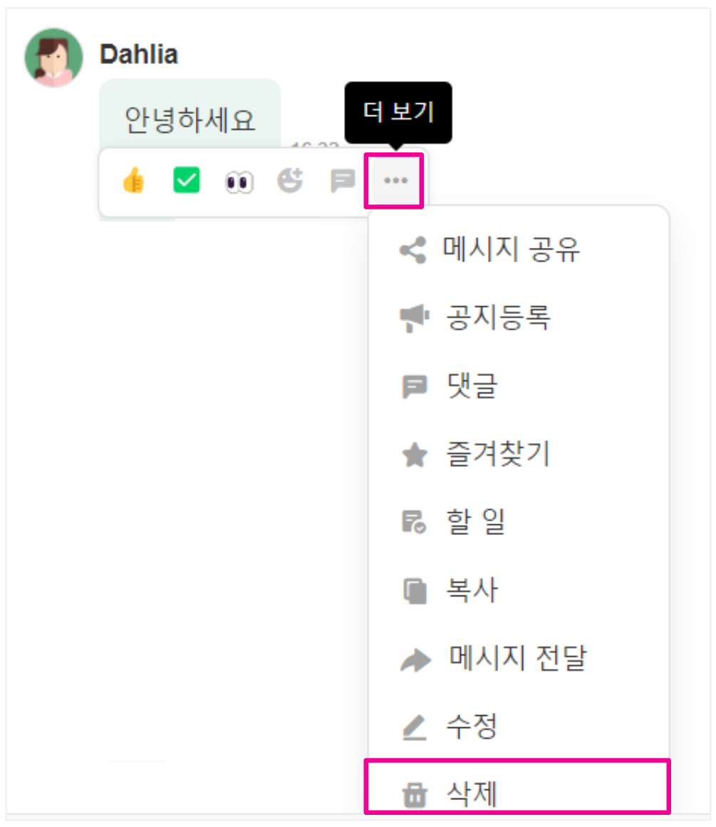 메시지에 마우스를 올렸을 때 나타나는 [...] 더보기 버튼을 클릭해 [삭제] 메뉴를 선택하여 삭제합니다.