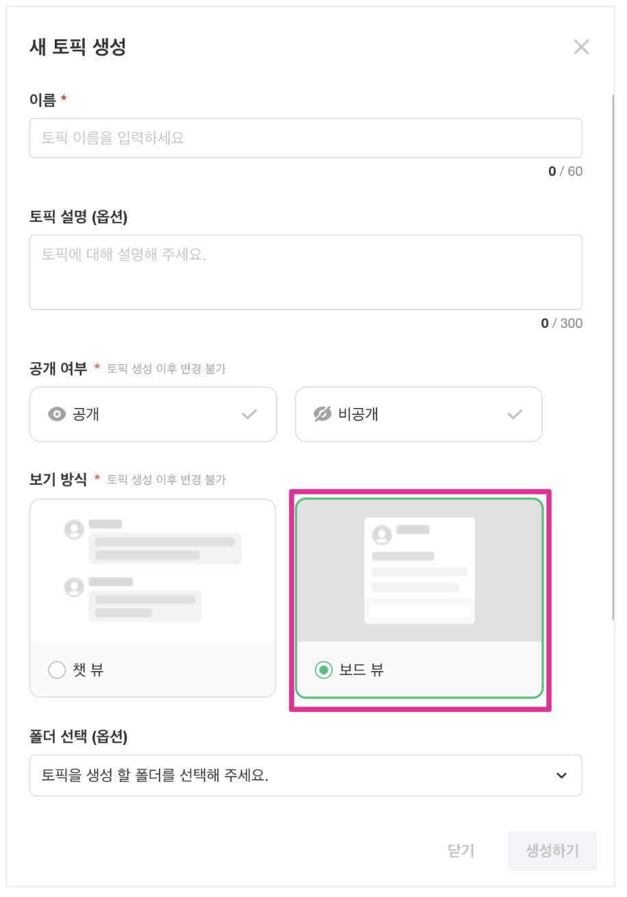 보기 방식과 공개 여부는 토픽 생성 이후에는 변경이 불가능하오니, 신중하게 선택해주세요.