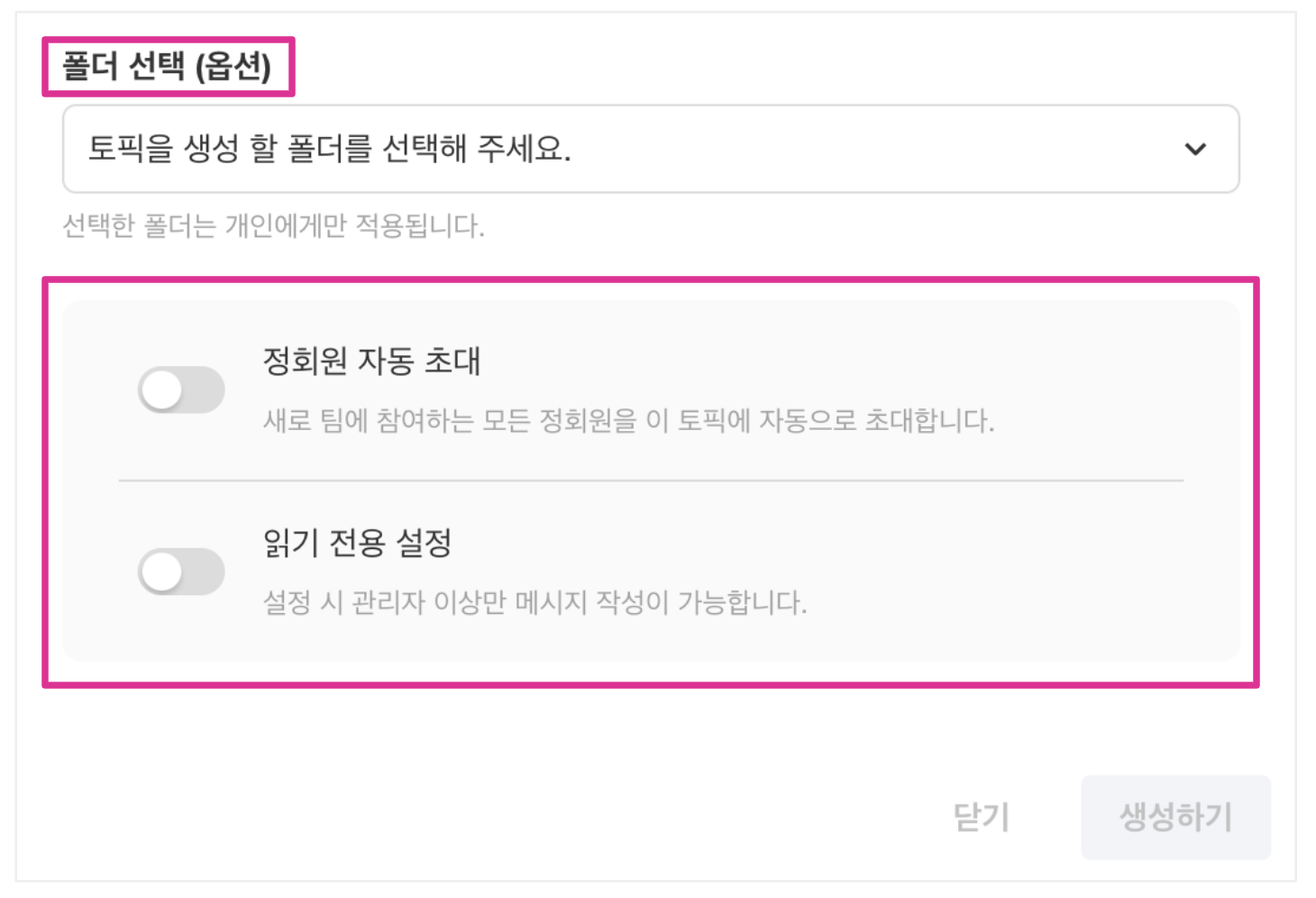 [폴더 선택]에서는 신규 토픽이 들어갈 폴더를 생성하거나 폴더 지정이 가능합니다.