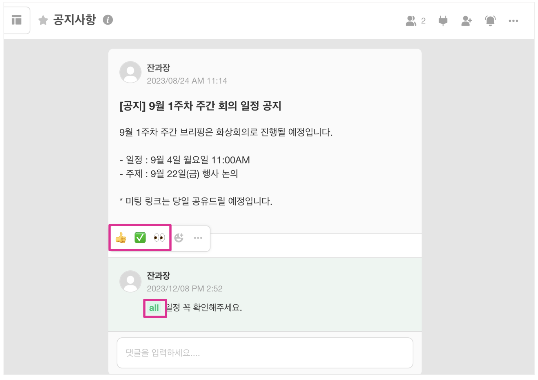 게시글에는 @all 멘션이 가능하므로 전체 공지를 할 수 있습니다.