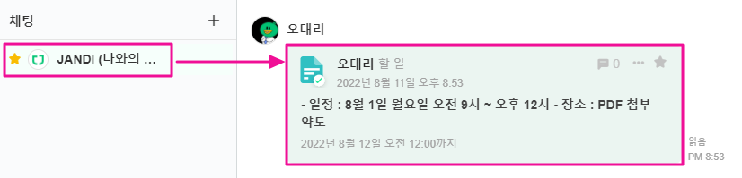 지정한 할 일은 JANDI 채팅에서 확인할 수 있습니다.
