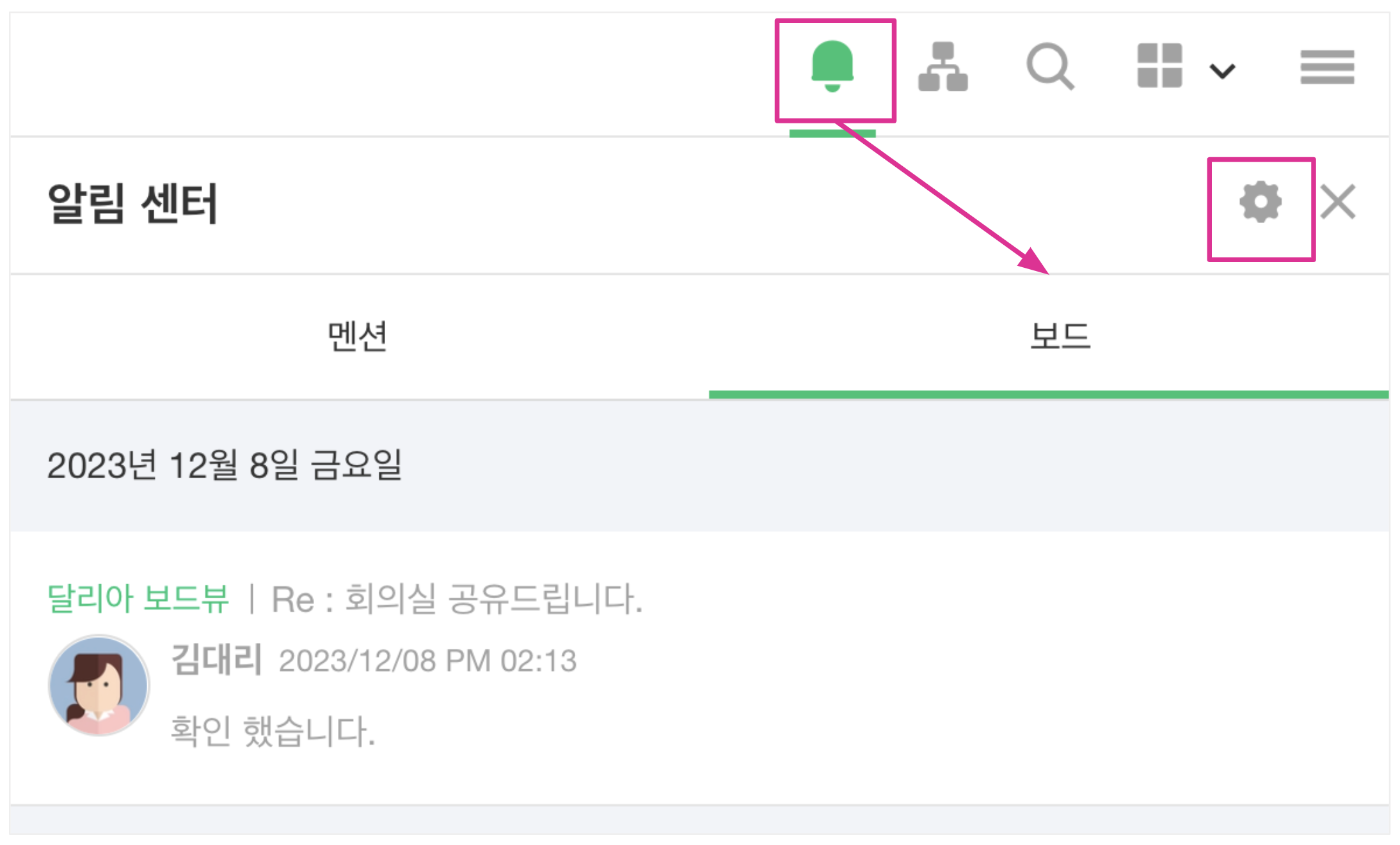 상단의 알림센터 아이콘 클릭 > 보드에서 보드뷰의 업데이트 사항을 알림 받을 수 있습니다.