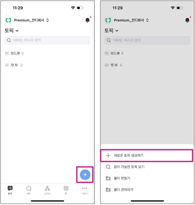 1. 잔디 화면에서 (+) 버튼을 터치하고 [새로운 토픽 생성하기]를 눌러주세요.