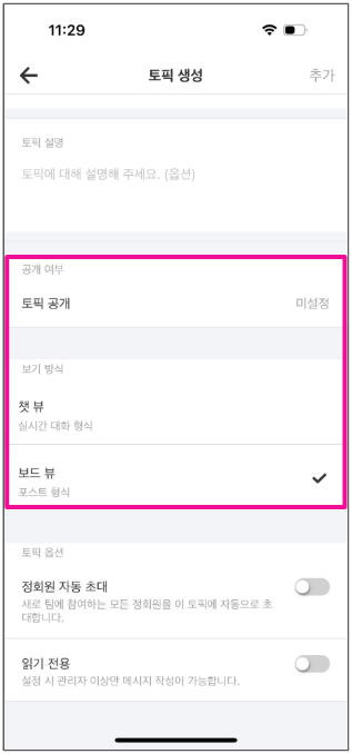 2. [새로운 토픽 생성하기]에서 보기 방식을 보드 뷰로 체크하고 이름/공개 여부/자동 초대 여부 등을 설정하신 후 [추가]를 누르면 새 보드 뷰 토픽이 생성됩니다.