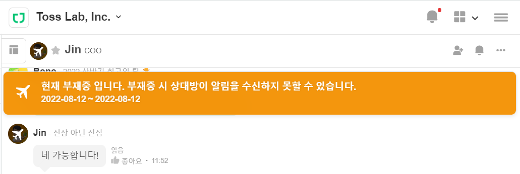 3. 부재 중 설정을 한 멤버는 다른 팀 멤버들에게 프로필 사진이 비행기 아이콘으로 보이며, 채팅 상단에 다음과 같은 메시지가 나타납니다.