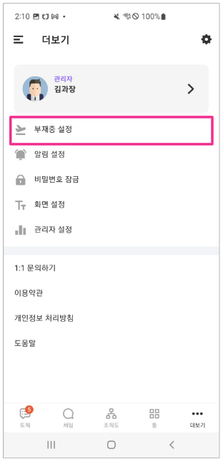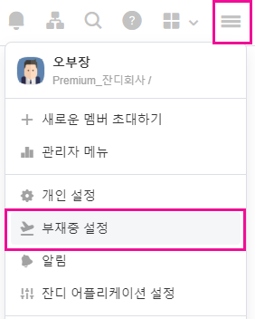 1. 메뉴바 상단 [≡] - [부재 중 설정] 메뉴를 선택합니다.