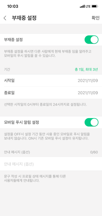2. 부재 중 설정을 체크해서 켜주시고, 기간을 선택해주세요.