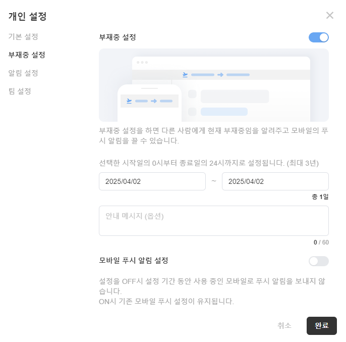 *모바일 푸시 알림 설정을 꺼놓으시면 부재 중 기간 동안 모바일로 잔디 푸시 알림을 받지 않게 됩니다. 해당 설정을 켜놓으시면 기존 푸시 설정이 유지됩니다.