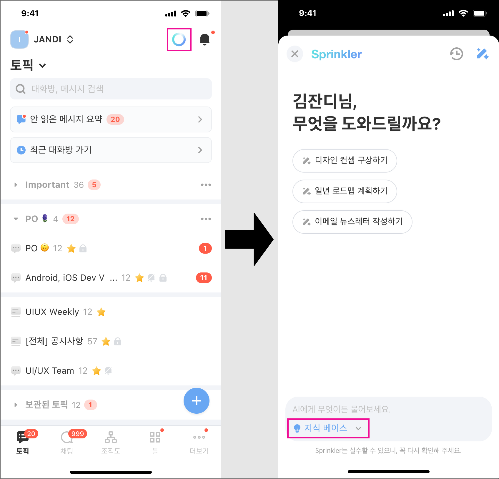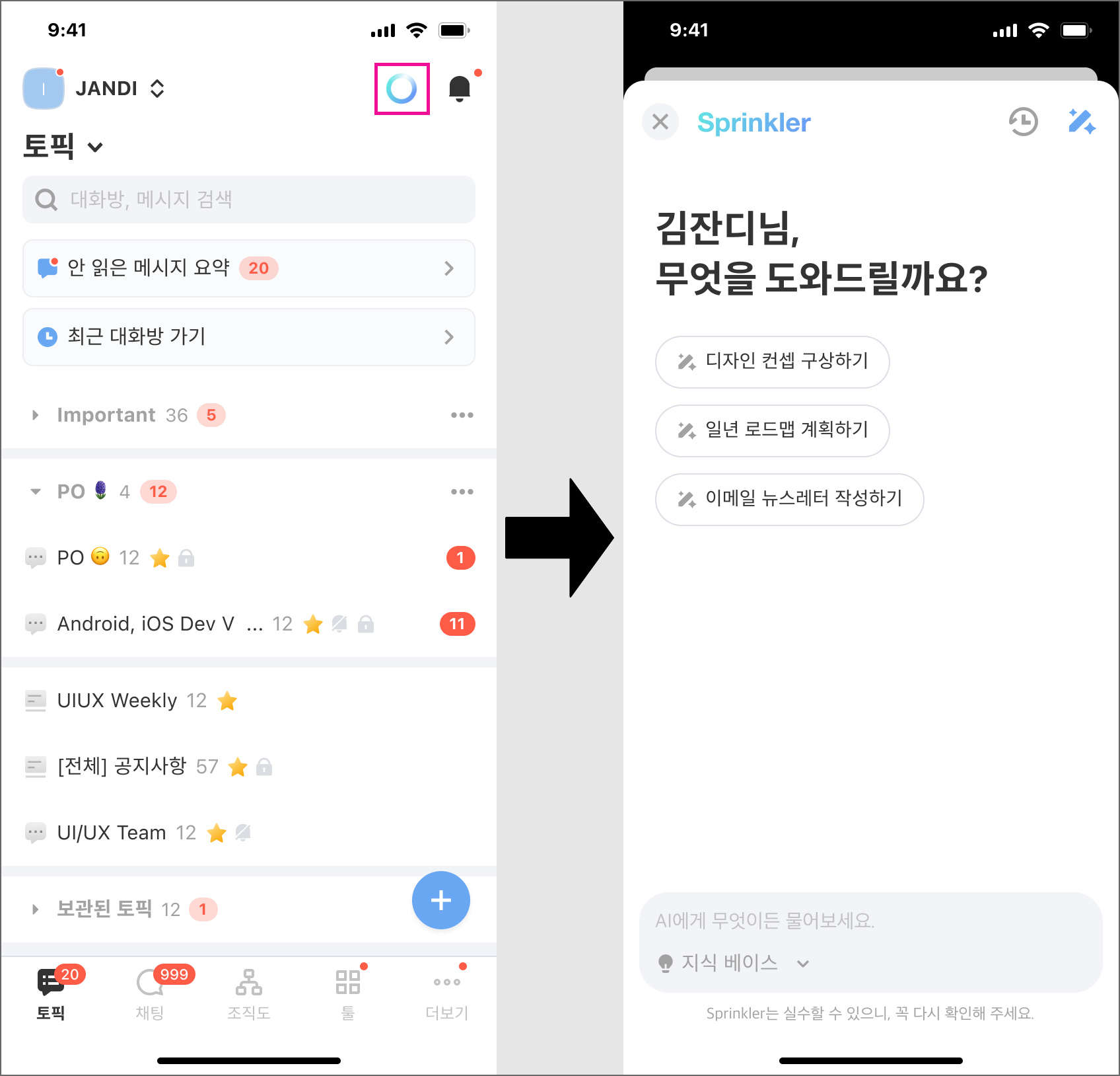 대화방(토픽&채팅)에서 주고받은 메시지의 내용을 요약하고, 해당 내용을 바탕으로 질문에 답변을 얻을 수 있는 기능입니다.