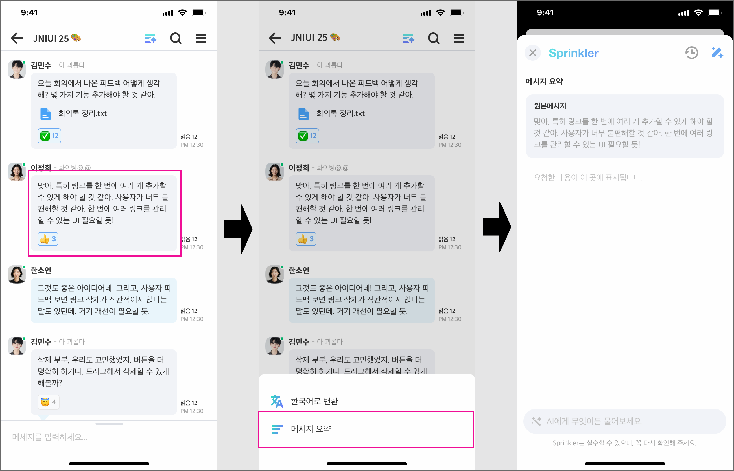 읽지 않은 메시지를 대화방별로 주요 내용을 자동으로 요약해 핵심만 빠르게 파악할 수 있습니다. 대화방을 클릭하면 해당 위치로 바로 이동해 이어서 확인할 수 있습니다.