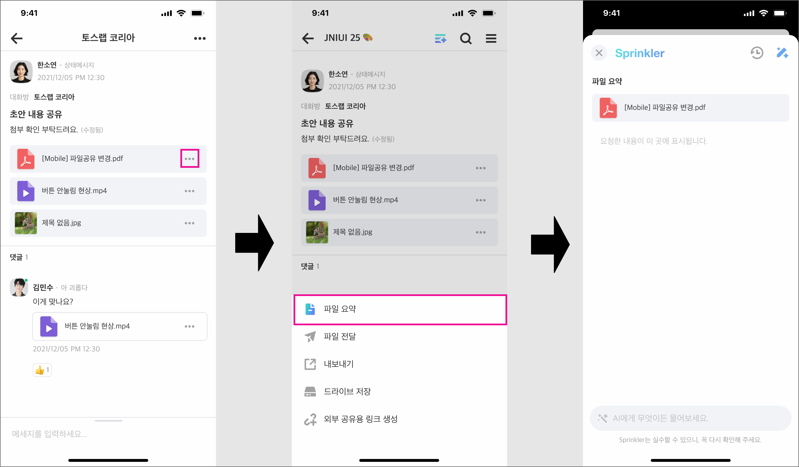 파일 요약 사용 방법 : 파일 롱프레스 또는 메시지 선택 후 파일 옆 [...] 클릭 > 파일 요약 > 요청 내용 입력 > Enter