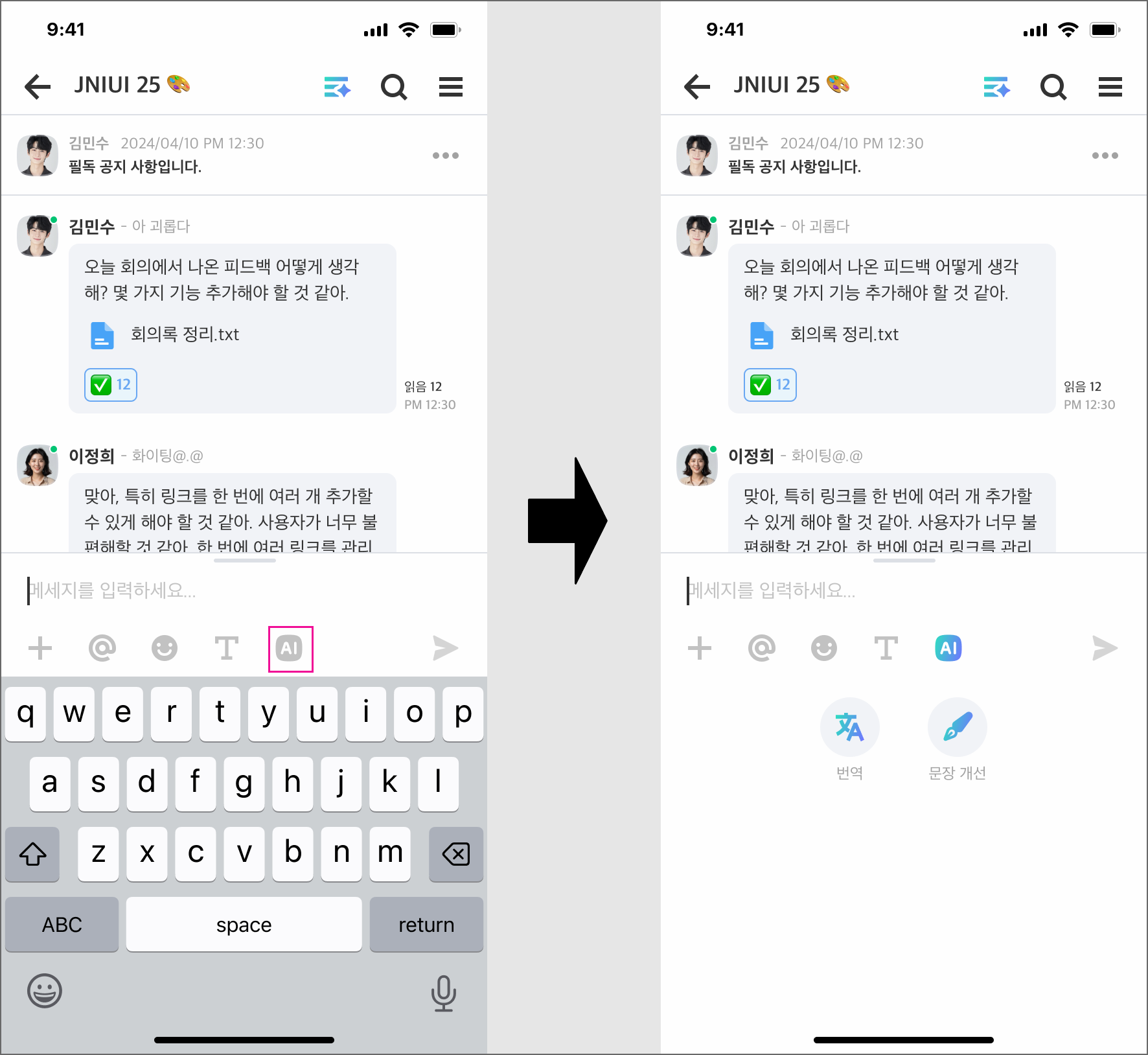 메시지 입력창에 작성한 내용을 AI가 자연스럽게 수정하거나 외국어로 번역해주는 기능입니다.