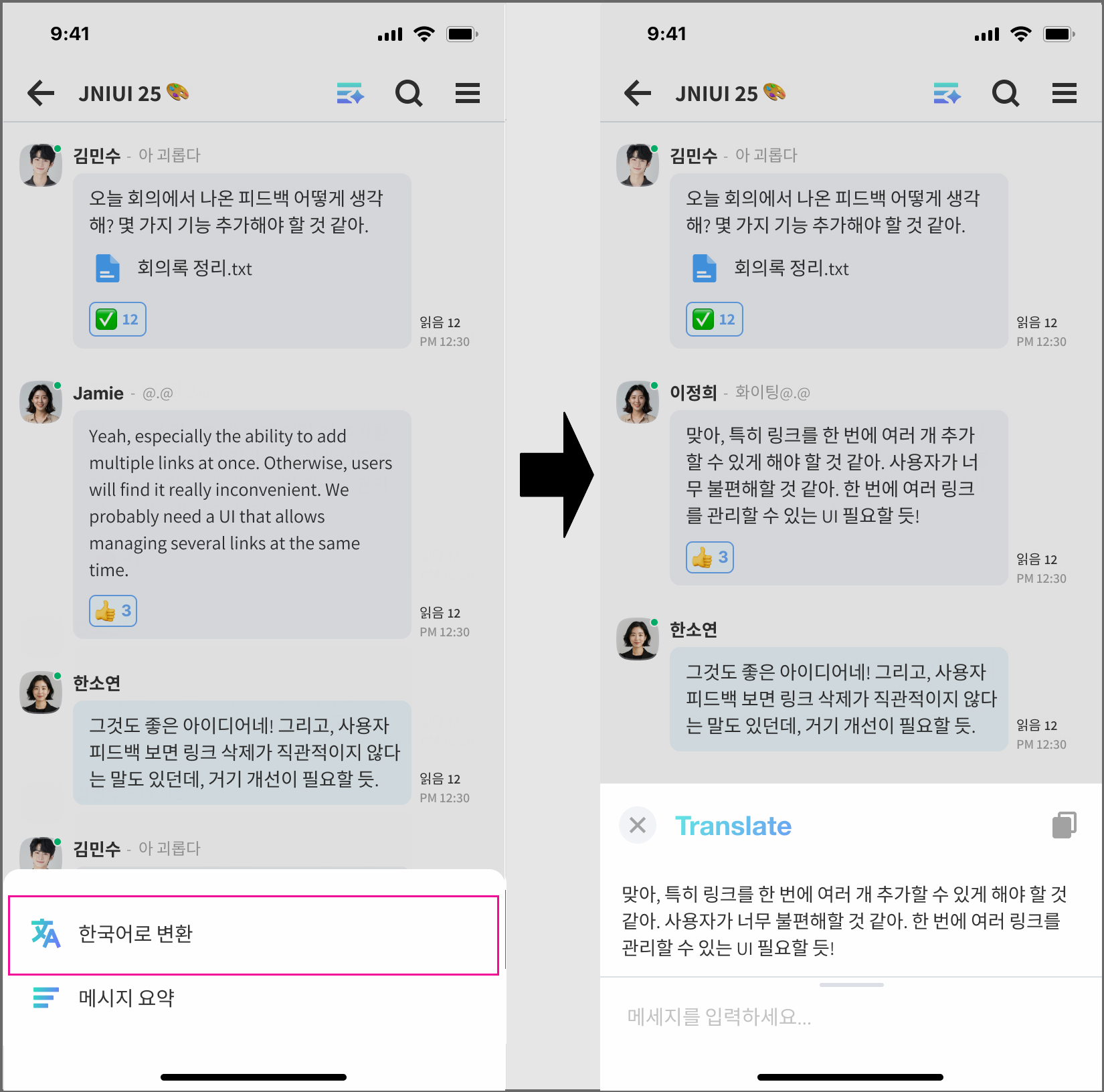 다국어로 수신한 메시지를 잔디 설정 언어로 변환해 주는 기능입니다.