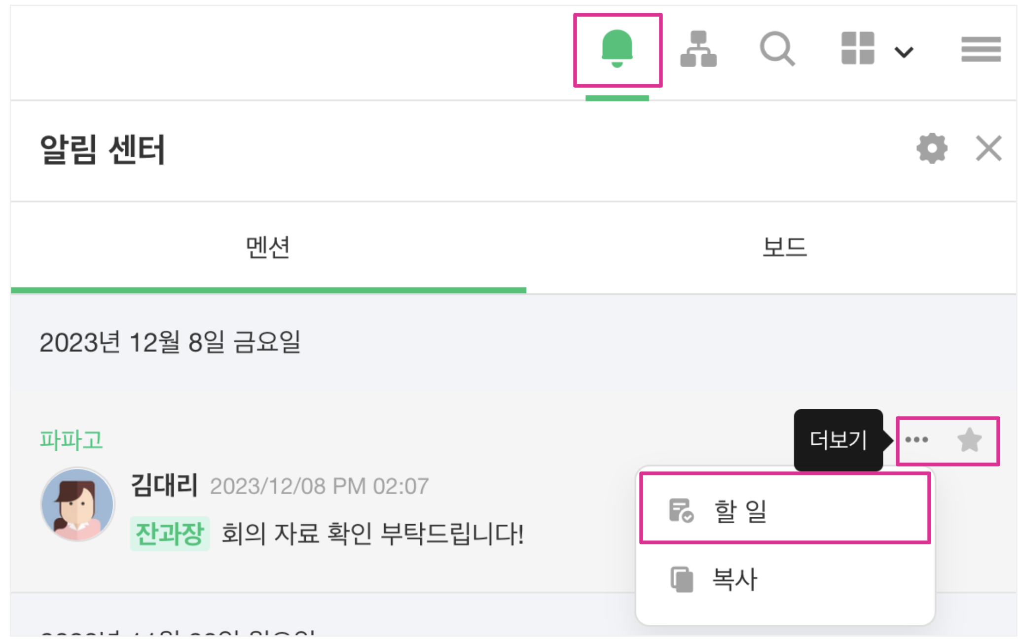 할 일 만드는 방법 : 메시지 우측 부분 [... 더 보기 > [할 일] 클릭 후 생성
