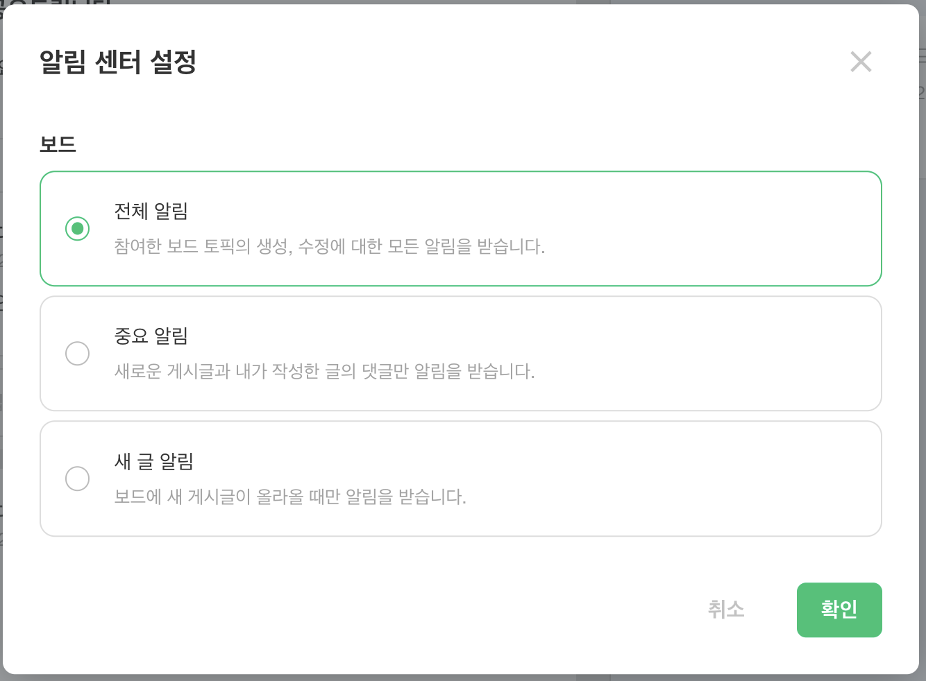 방법 : 알림 센터 우측 상단의 [설정] > 전체 / 중요 / 새 글 알림 선택 후 [확인]