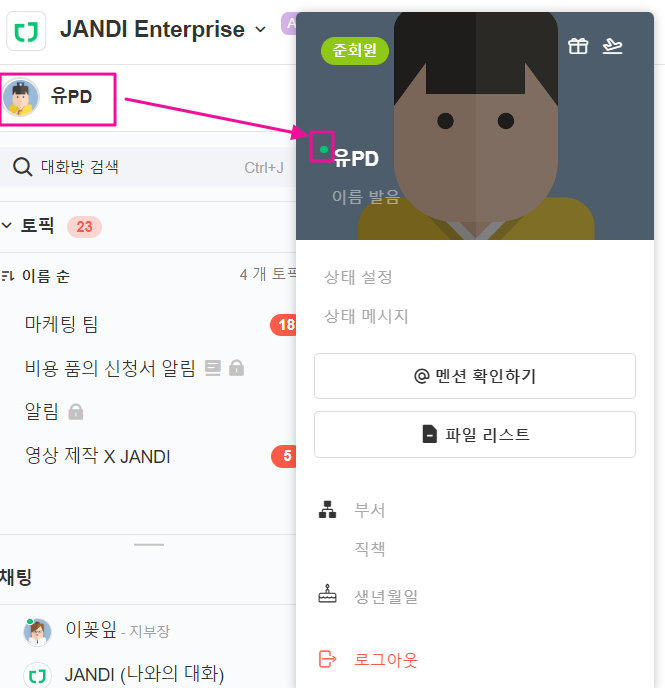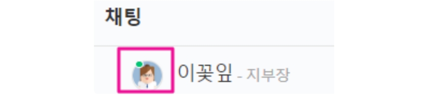 채팅 멤버 프로필의 왼쪽 상단에서 초록색 점을 확인하실 수 있습니다.