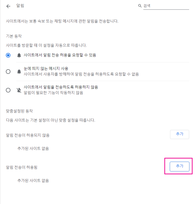5. 알림을 받지 않도록 한 팀의 도메인 URL을 확인하시고 알림을 [허용]하거나 [추가]해주세요.