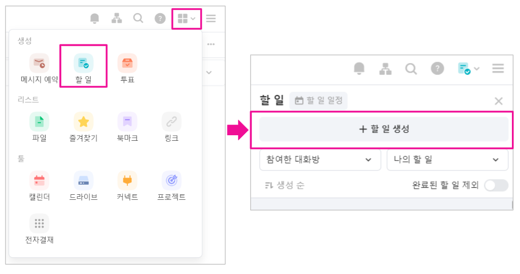 나의 업무리스트 뿐만 아니라 협업을 위한 업무 분장에 필요한 할 일을 무제한으로 추가해서 업무 생산성을 높일 수 있습니다.