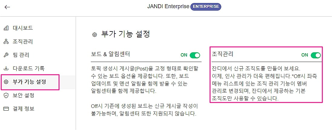 단, 조직관리 기능을 ON으로 설정 시에만 사용이 가능합니다.