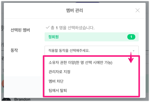 cf. (멤버 차단 및 탈퇴 / 관리자 지정 / 소유권 이양) 멤버의 권한 변경 방법이 궁금합니다.