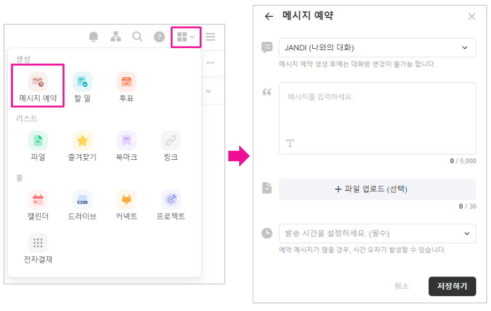 원하는 시간을 지정하여 다른 멤버에게 꼭 전달해야 하는 메시지가 있다면 예약 발송 기능을 사용해 보세요! 메시지 예약 발송은 멤버당 최대 30건까지 예약이 가능하며 15분 단위로 시간 선택을 할 수 있고, 발송일 기준으로 최대 90일까지 선택할 수 있습니다.