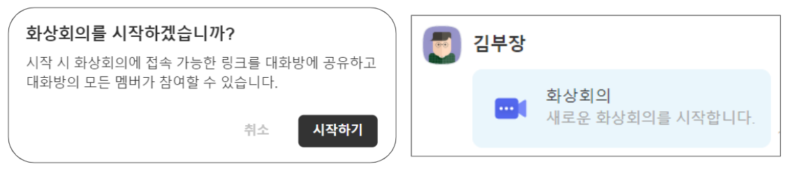 메시지 입력창 하단 화상회의 아이콘 클릭해 [화상회의] 메시지를 전송합니다.
