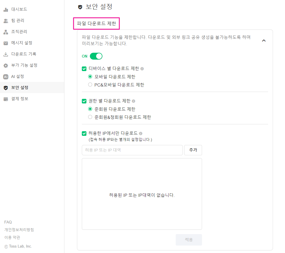 허용한 IP에서만 다운로드 (접속 허용 IP와는 별개의 설정입니다)