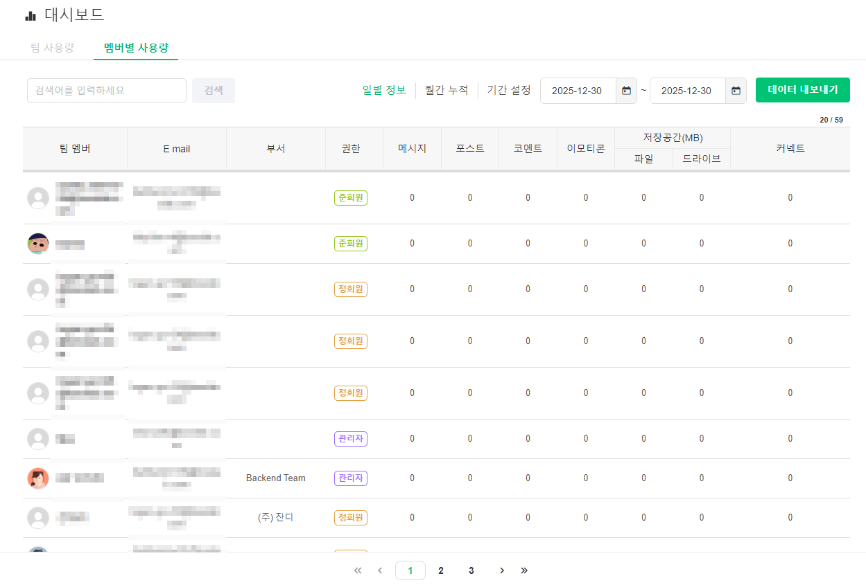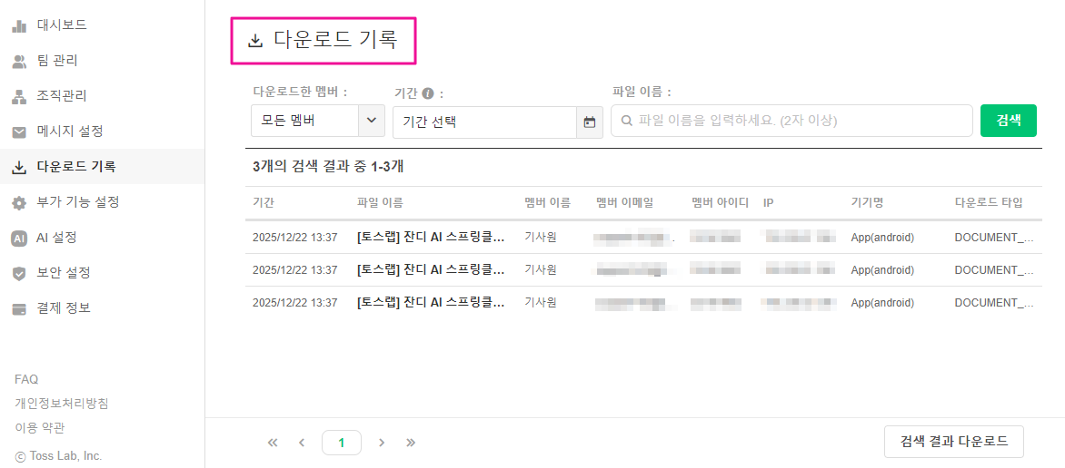 팀 관리자가 특수한 경우에 파일 다운로드 기록을 확인해야할 경우가 있다면, [관리자 메뉴] – [다운로드 기록]에서 일부 다운로드 정보를 제공하고 있습니다.
