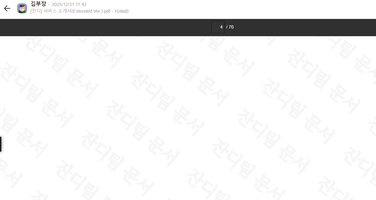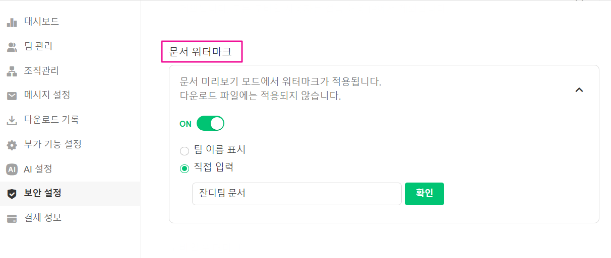 문서 미리보기 모드에서 워터마크가 표시되도록 설정할 수 있습니다. 워터마크는 팀 이름 / 직접 입력 중 선택이 가능합니다.